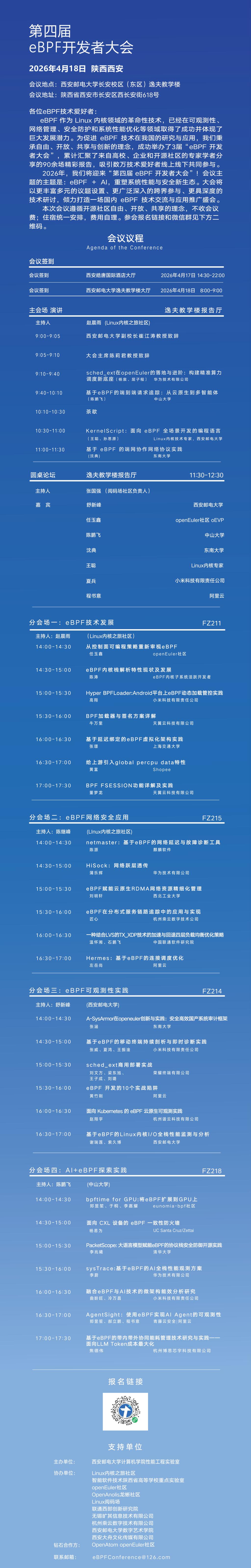 eBPF作为Linux内核领域的重要技术,近年来已在系统可观测性、网络管理、安全防护和性能优化等方面展现出广阔应用前景。为促进eBPF技术在我国的研究、传播与应用,推动操作系统、系统安全、性能优化与人工智能等方向的学术交流与协同创新,计算机学院定于2026年4月18日举办第四届eBPF开发者大会。本次大会以“eBPF+AI,重塑系统性能与安全新生态”为主题,秉承自由、开放、共享、创新的理念,邀请来自高校、企业和开源社区的专家学者围绕eBPF相关前沿理论、关键技术与典型应用开展深入交流。我们诚挚邀请相关领域教师和同学踊跃参加。