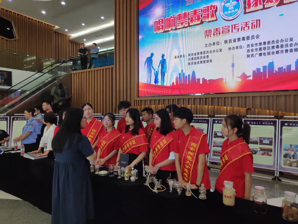 我校青年志愿者协会承担了活动的宣传讲解工作,志愿者们在雁塔区禁毒办工作人员的带领下,向参加活动的群众宣传国家禁毒法律法规,讲解毒品的种类、危害和识别防范方法等知识,提醒大家自觉遵守法律法规,不断加强禁毒知识的学习,进一步提升广大群众的识毒、防毒、拒毒能力。