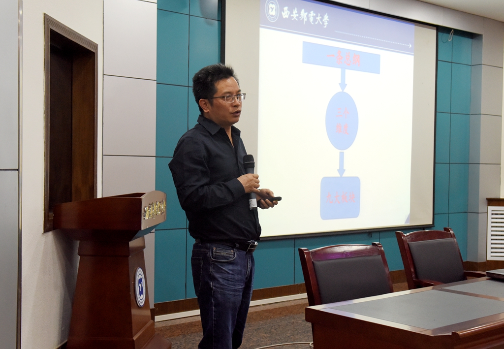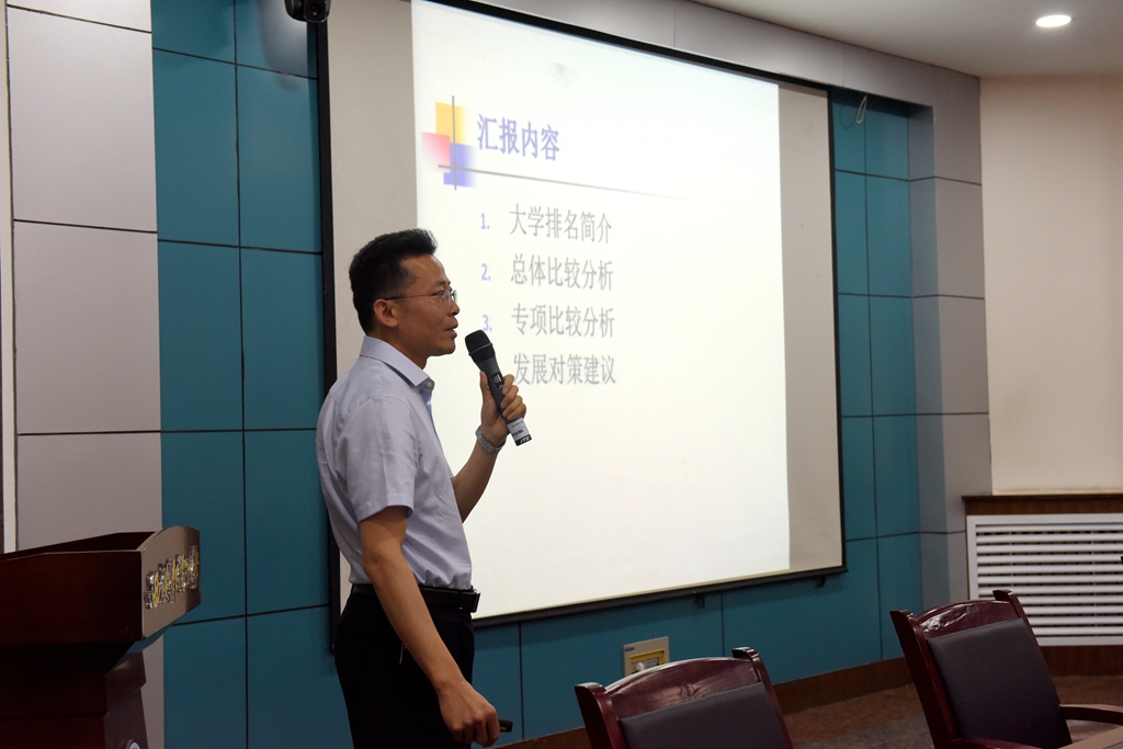 潘新兴从大学排名简介、总体比较分析、专项比较分析、发展对策建议等四个方面做了深入阐述。他对国际知名的大学排行榜、国内主要大学排行榜作了简要介绍,分析了武书连大学排名的三个指标体系。以国内8所同行业高校和省内8所理工类高校为基础,对2004年至2018年十五年间高校排名情况作了对比。从研究生培养、本科生培养、自然科学研究、社会科学研究等四项分值入手,分析了我校十五年间的变化情况。从近五年我校教师水平、新生水平、自然科学类专业、社会科学类专业与相关高校进行了专项排名对比,有针对性的从9个方面提出了西邮的发展对策及建议。