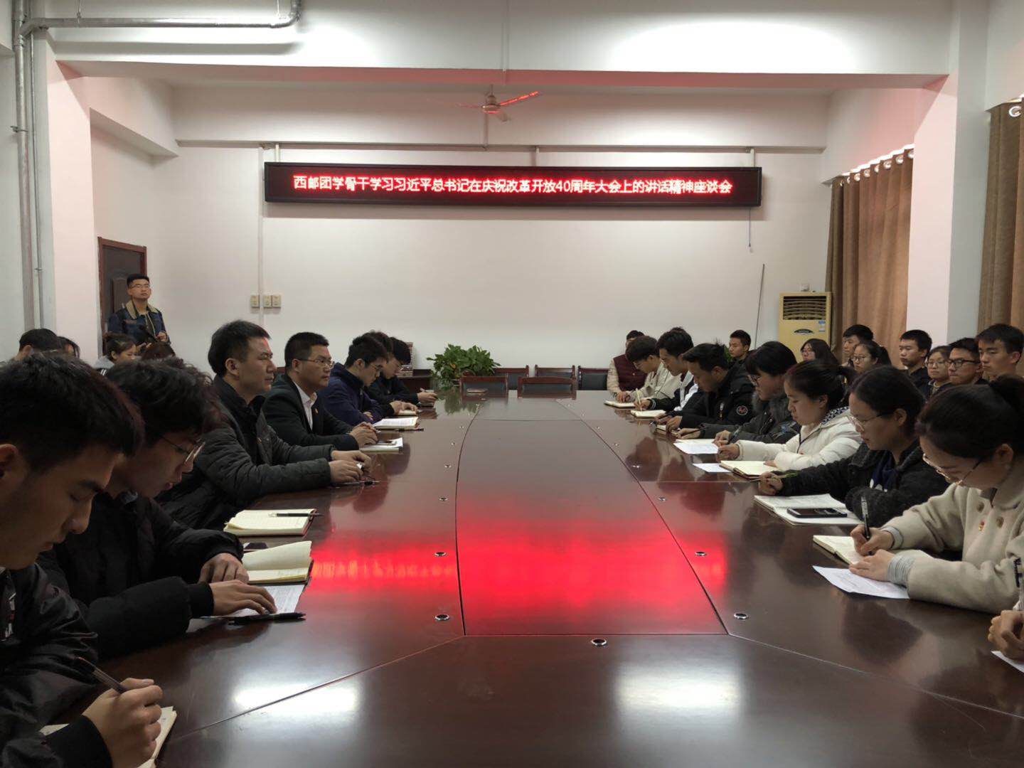 本网讯 为庆祝改革开放40周年大会胜利召开,营造团结奋进的校园氛围,展示我校团员青年在改革开放过程中敢于拼搏、奋发有为的良好精神面貌,激励全校学生不忘初心,牢记使命,开拓进步、努力学习。12月18日中午,校团委在学工部会议室举办学习习近平总书记在庆祝改革开放40周年大会上的重要讲话精神座谈会。