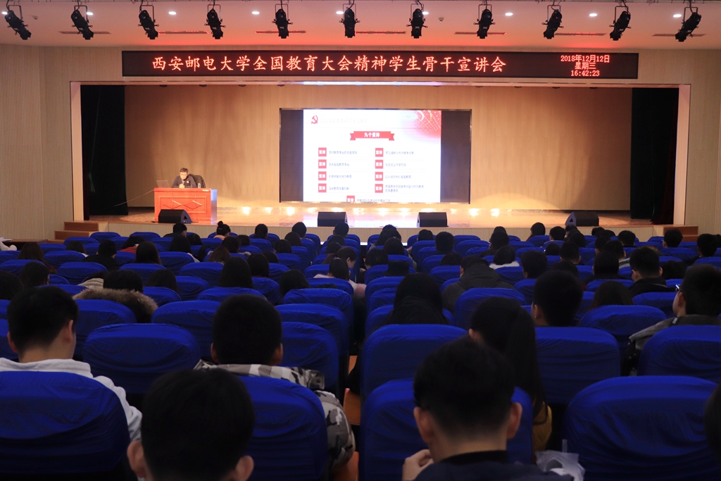 本网讯(通讯员 刘璟  摄影 魏嘉仪 师嘉琪 孙梦泽 )12月12日下午,学生工作部在长安校区西区国际会议中心、东区逸夫报告厅和雁塔校区图书馆报告厅同时举行全国教育大会精神宣讲会,组织优秀辅导员代表杨俐、张增峰、白春乐、刘琳、曹江面向1500名学生骨干深入宣讲全国教育大会精神。