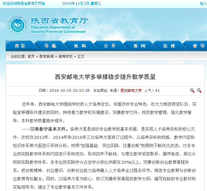 近年来,西安邮电大学围绕学校的人才培养定位,依据该校专业特色,在大力推进师资队伍、实验室等硬条件建设的同时,持续着力教学软环境建设,完善教学文件,规范教学管理,强化教学督导,本科教学质量稳步提升。