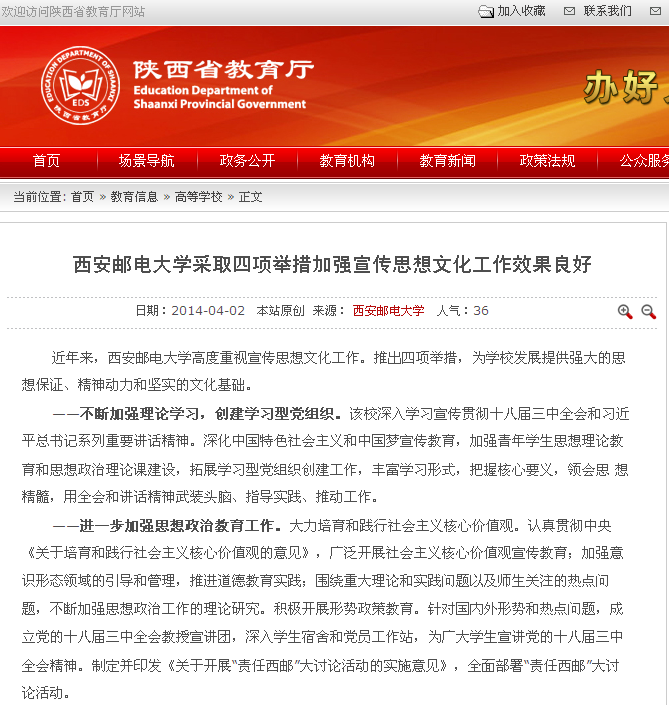 ——围绕中心、服务大局,坚持“三贴近”方针,努力做好新闻宣传工作。该校坚持新闻宣传工作“三贴近”原则,弘扬主旋律,传播正能量,进一步加强新闻网建设,规范新闻网发布流程和内容,逐步完善新闻视频功能,实现了文、图、声、像四位一体的新闻报道方式。充分发挥《西安邮电大学报》的主阵地作用。加强与主流媒体的合作,全面展示办学水平和办学成就,塑造学校良好形象;大力宣传学校的典型人物和先进事迹,不断增强师生员工奋发进取的内在动力;加强微信、微博等新媒体建设,提升宣传工作信息化水平,打造具有西邮特色的文化传播平台。